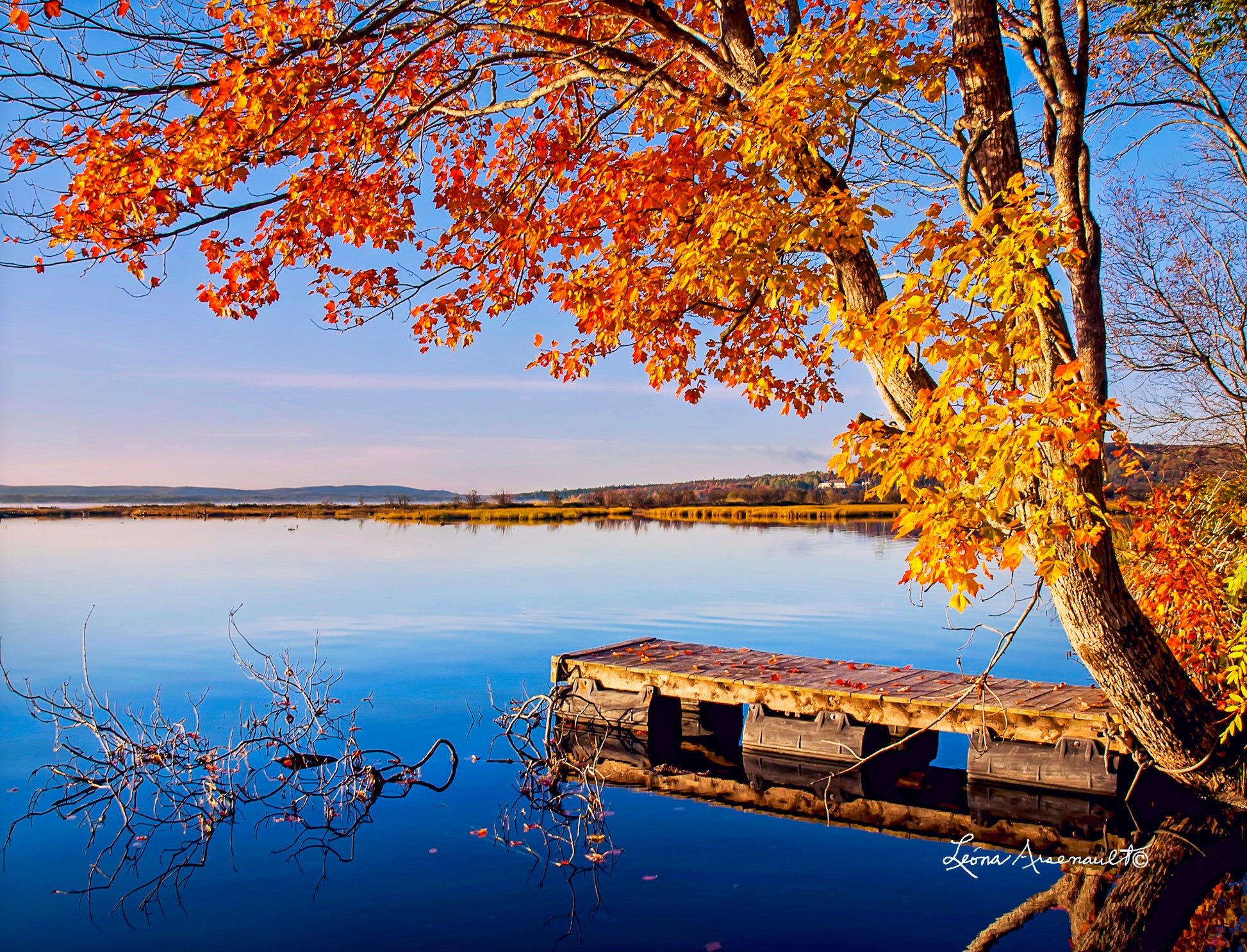 Beneath a canopy of glowing orange and gold, a quiet dock extends into the calm waters of Baddack in Cape Breton. The surface is glassy and reflective, mirroring the tree, the dock, and the clear blue sky in a moment that feels untouched and unhurried. Distant hills soften the horizon, completing a scene rich with balance, light, and the quiet beauty of fall.